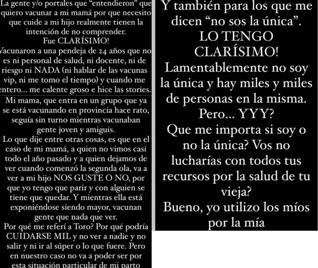 Y remarcó con mucha indignación: "Mi mamá, que entra en un grupo en el que en Provincia de Buenos Aires se está vacunando hace rato, seguía sin turno mientras se vacunaban gente joven y amiguis. Lo que dije, entre otras cosas, es que en el caso de mi mamá, a quien no vimos casi todo el año pasado y a quien dejamos de ver cuando comenzó la segunda ola, va a ver a mi hijo nos guste o no porque yo tengo que parir y con alguien se tiene que quedar. Y mientras ella está exponiéndose siendo mayor, vacunan gente que nada que ver".
