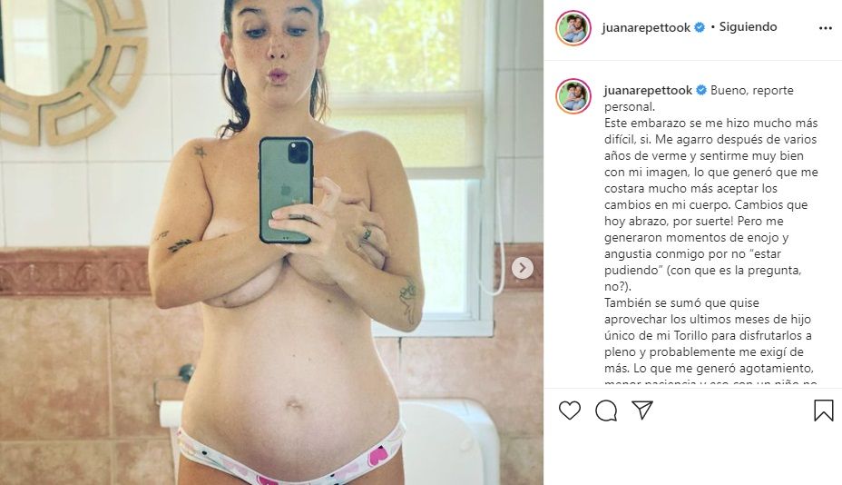 “Bueno, reporte personal. Este embarazo se me hizo mucho más difícil, sí. Me agarro después de varios años de verme y sentirme muy bien con mi imagen, lo que generó que me costara mucho más aceptar los cambios en mi cuerpo. ¡Cambios que hoy abrazo, por suerte!”, comenzó diciendo.