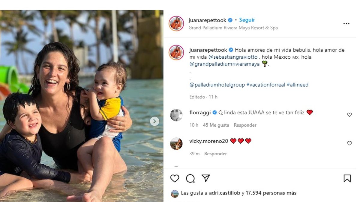 El destino elegido por la familia fue México y desde allí la actriz compartió varias postales de sus días a pura agua y sol, en un lugar paradisíaco. "Hola amores de mi vida bebulis, hola amor de mi vida @sebastiangraviotto, hola México", expresaba feliz Juana en Instagram.