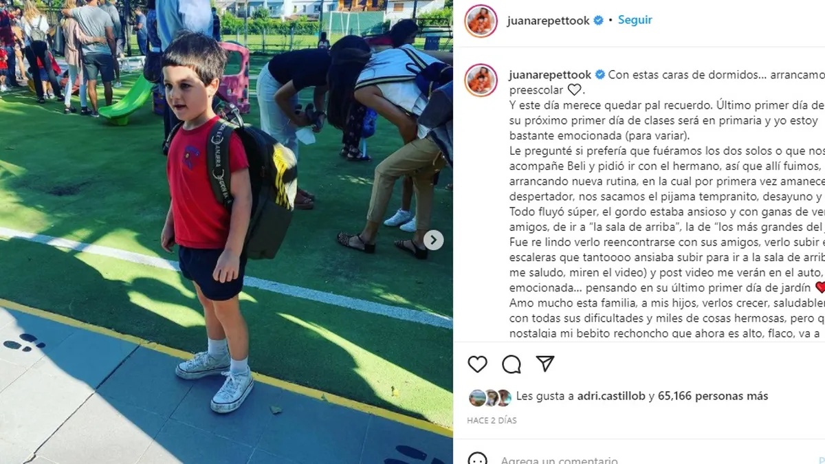 “Importa habernos levantado felices, ansioso, desayuno planificado del día de anterior, la expextativa de la nueva rutina matinal, la mochi nueva, el snak y su termo nuevo, la sala de arriba, preparnos para ir todos juntos, los amigos. Todo fue hermoso, ¡una mañana espectacular! ¡Imagináte lo que nos importa o modifica el estado de sus zapatillas! ¡Nada!”. finalizó contundente Juana Repetto.