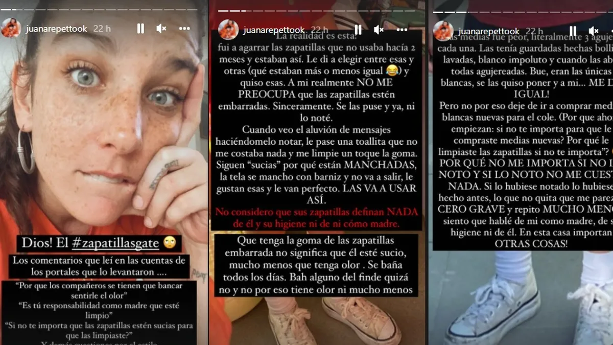 “La realidad es esta: fui a agarrar las zapatillas que no usaba hace dos meses y estaban así. Le dí a elegir entre esas y otras, que estaban más o menos igual, y quiso esas. A mí realmente NO ME PREOCUPA -destacó en mayúsculas- que las zapatillas estén embarradas. Sinceramente se las puse y ya, ni lo noté”, aclaró Juana Repetto desde sus historia de Instagram.
