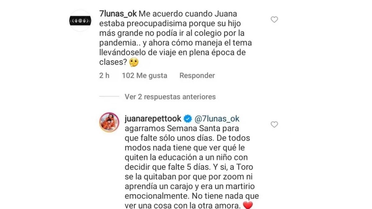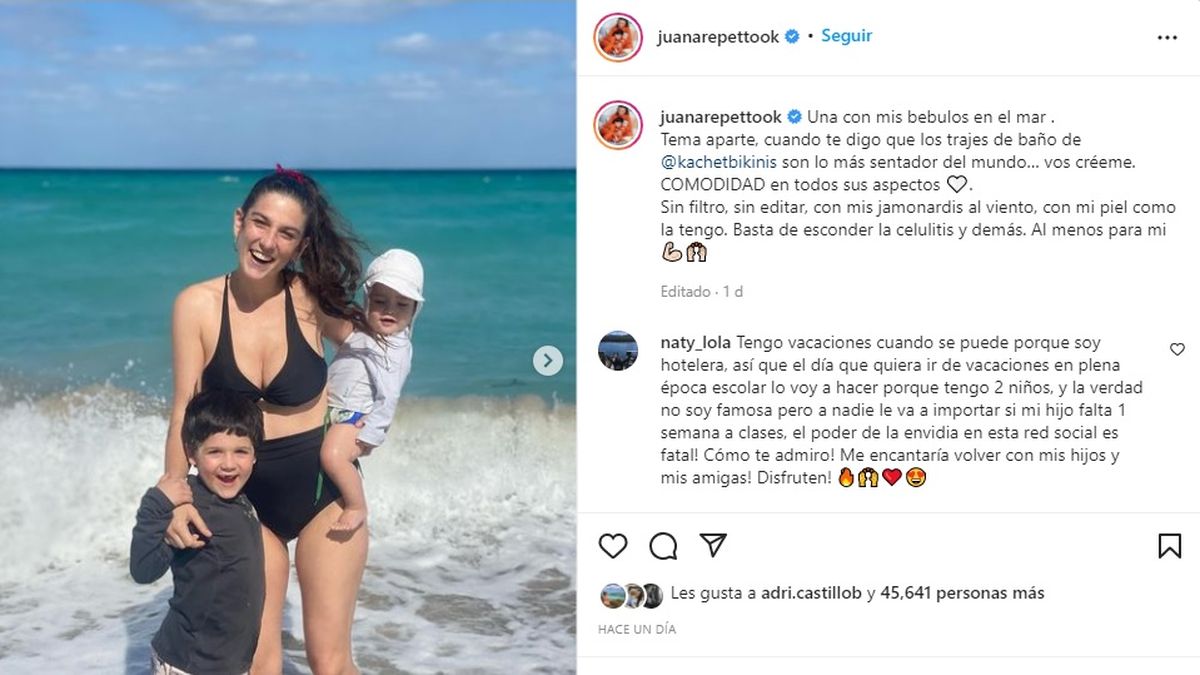 Lo cierto es que curiosamente desde Instagram una usuaria cuestionó el momento en que Juana se fue de vacaciones con sus dos hijos, argumentando que los niños pierden varios días de clases.