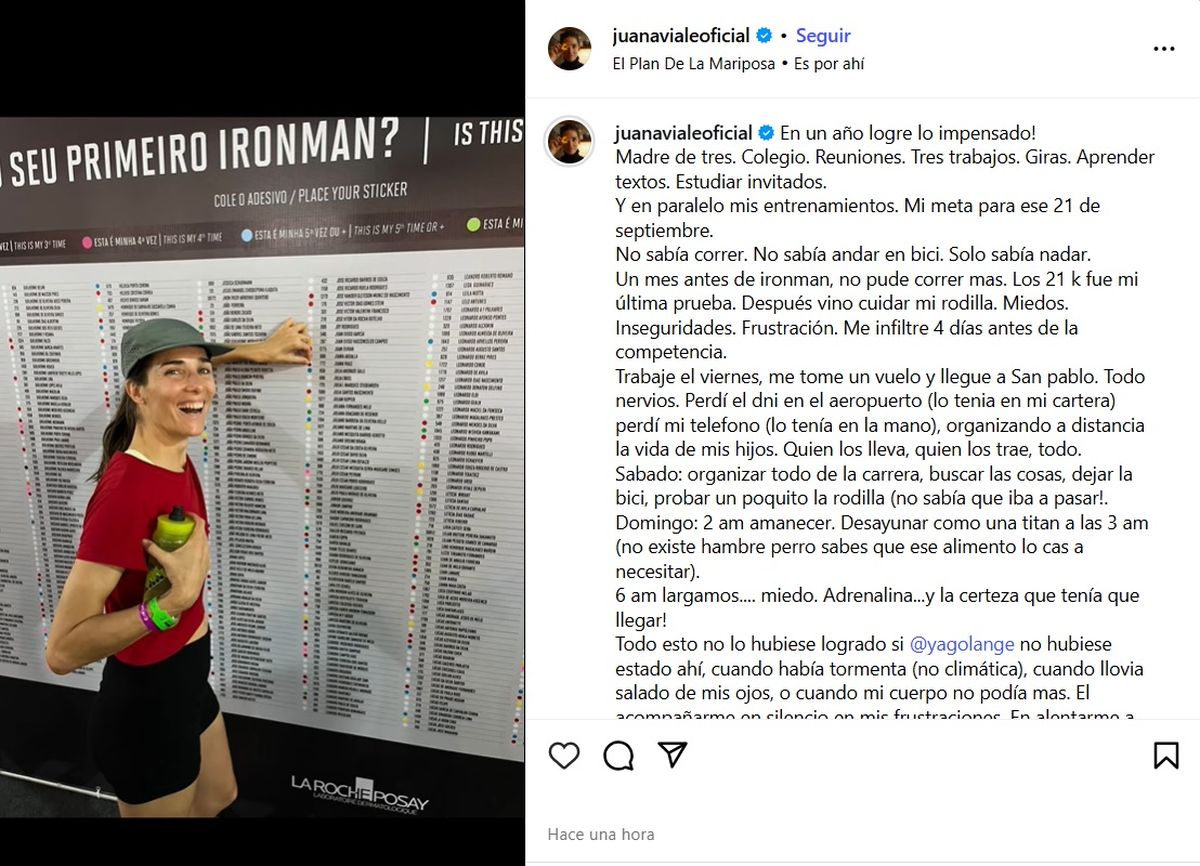 "¡En un año logré lo impensado! Madre de tres. Colegio. Reuniones. Tres trabajos. Giras. Aprender textos. Estudiar invitados. Y en paralelo mis entrenamientos. Mi meta para ese 21 de septiembre. No sabía correr. No sabía andar en bici. Solo sabía nadar", comenzó su posteo la nieta de Mirtha Legrand.