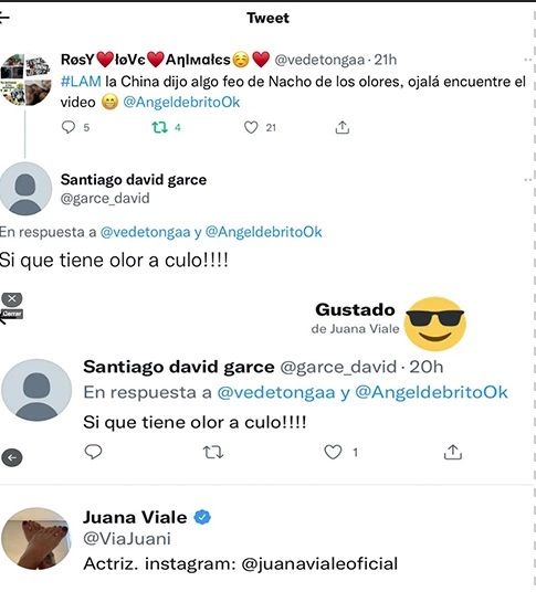 En esto, notaron que Juana puso “like” a un mal comentario sobre la China. “La China dijo algo feo de Nacho sobre los olores. Ojalá encuentre el video”, escribió ayer un usuario en la red social logrando el “me gusta” de Juana.