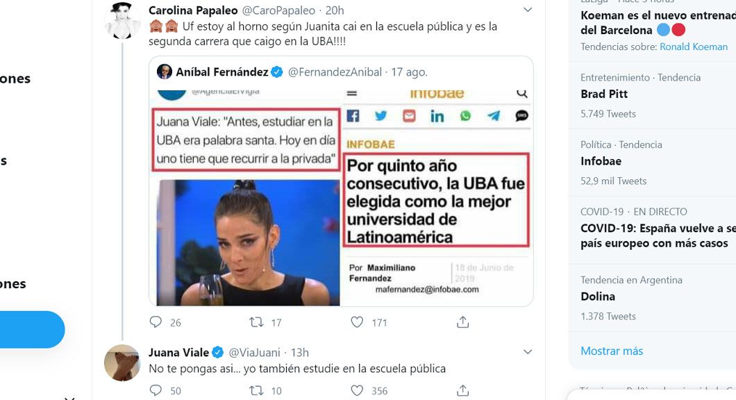 Todo esto generó un gran revuelo en las redes. El primero en contestarle fue Jorge Rial, que escribió: "Juana Viale dijo algo así como 'caes en la educación pública'. Tiene el secundario nada más. Ella tiene el secundario y viajó a Estados Unidos a estudiar inglés, es todo lo que tiene Juana Viale".