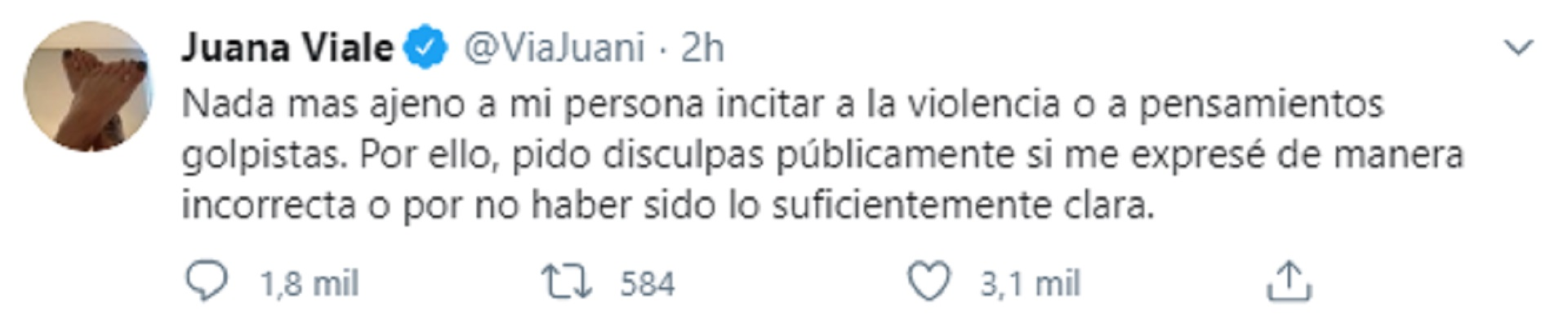 “La naturaleza del ser humano es imperfecta y a veces me pregunto qué tan humanos somos. Porque somos seres perfectamente imperfectos. Entonces, yo repito mis palabras y yo pido disculpas si ofendí a alguien, porque esa jamás fue mi intención. Yo no soy una operadora política de ningún espacio, yo soy una ciudadana más. Amo a mi país más que cualquier otra tierra y me duele ver el hambre, el desempleo, la pobreza, los jubilados olvidados... Me duelen los abusos, me duele la violencia de género, me duele ver animales abandonados, maltratados... Me duele ver cómo saquean nuestra tierra. Me duele la intolerancia, la injusticia. Me duele que crean que deseo un mal. Me duele la grieta”.