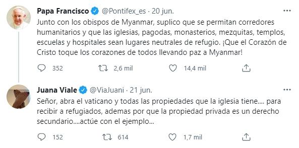 "Junto con los obispos de Myanmar, suplico que se permitan corredores humanitarios y que las iglesias, pagodas, monasterios, mezquitas, templos, escuelas y hospitales sean lugares neutrales de refugio. ¡Que el Corazón de Cristo toque los corazones de todos llevando paz a Myanmar!", expresó el sumo pontífice en Twitter.