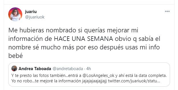 "Me hubieras nombrado si querías mejorar mi información de HACE UNA SEMANA obvio q sabía el nombre sé mucho más por eso después usas mi info bebé", remató Juariu.
