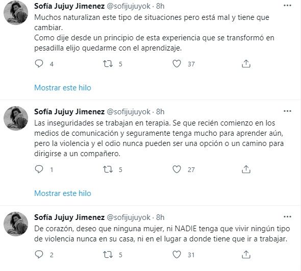 "Las inseguridades se trabajan en terapia. Se que recién comienzo en los medios de comunicación y seguramente tenga mucho para aprender aún, pero la violencia y el odio nunca pueden ser una opción o un camino para dirigirse a un compañero. Muchos naturalizan este tipo de situaciones pero está mal y tiene que cambiar. Como dije desde un principio de esta experiencia que se transformó en pesadilla elijo quedarme con el aprendizaje", cerró Jujuy.