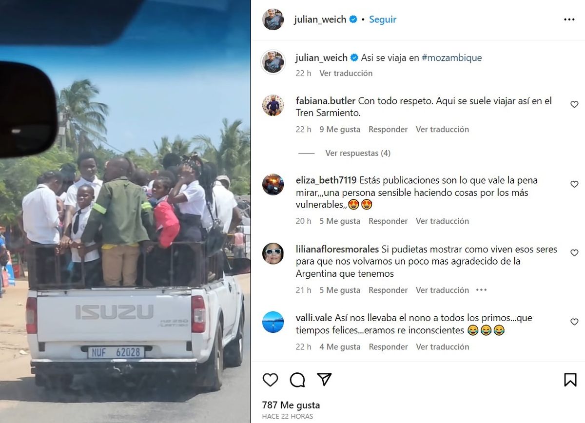 Allí Julián decidió apadrinarlo y no solo lo acompañó en sus estudios sino que lo integró a su familia. Además, el animador mostró aspectos del día a día allí y los multitudinarios viajes en camioneta: "Así se viaja en #mozambique", reflejó.