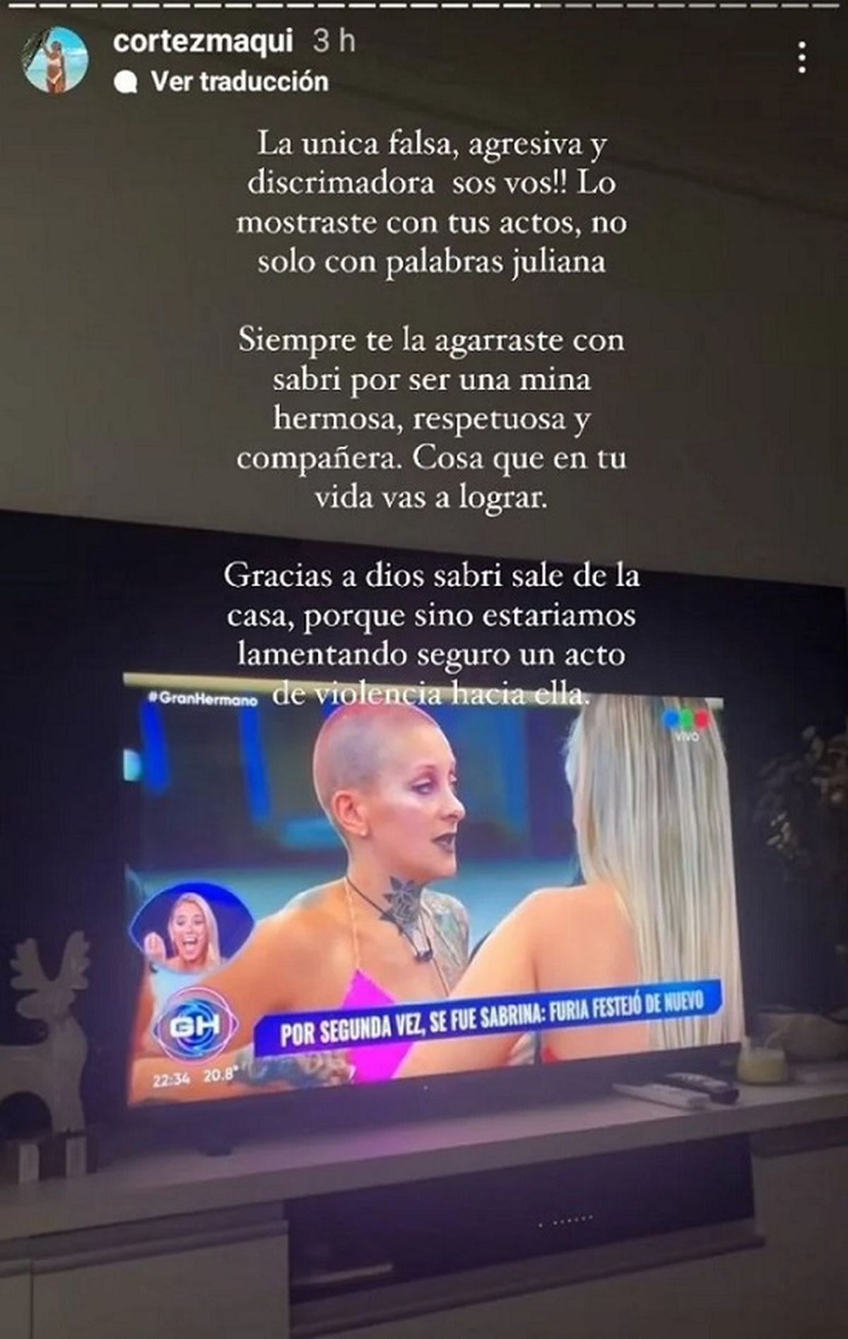 En este contexto, Macarena Cortez, hermana de la rubia, no dudó en salir a cruzar a la polémica participante por su reacción dentro de la casa cuando fue eliminada Sabrina.
