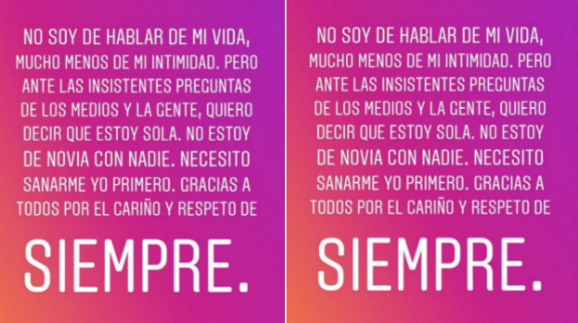 "No soy a hablar de mi vida, mucho menos de mi intimidad. Pero ante las insistentes preguntas de los medios y de la gente, quiero decir que estoy sola", describió la rubia en las Stories. Y agregó: "No estoy de novia con nadie. Necesito sanarme yo primero. Gracias a todos por el cariño y el respeto de siempre".