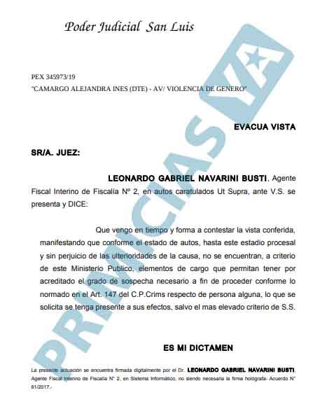 El tiempo pasó y la Justicia de San Luis se expidió. En su escrito, el fiscal que trabajó en la denuncia afirma que no encuentra pruebas para avanzar y deja sin efecto lo expuesto por Alejandra Camargo.