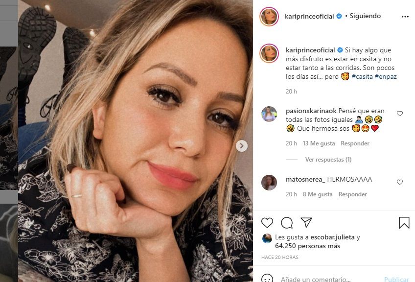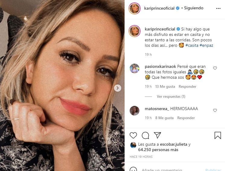 "Si hay algo que más disfruto es estar en casita y no estar tanto a las corridas. Son pocos los días así... pero #casita #enpaz", expresó la artista tropical en su posteo.
