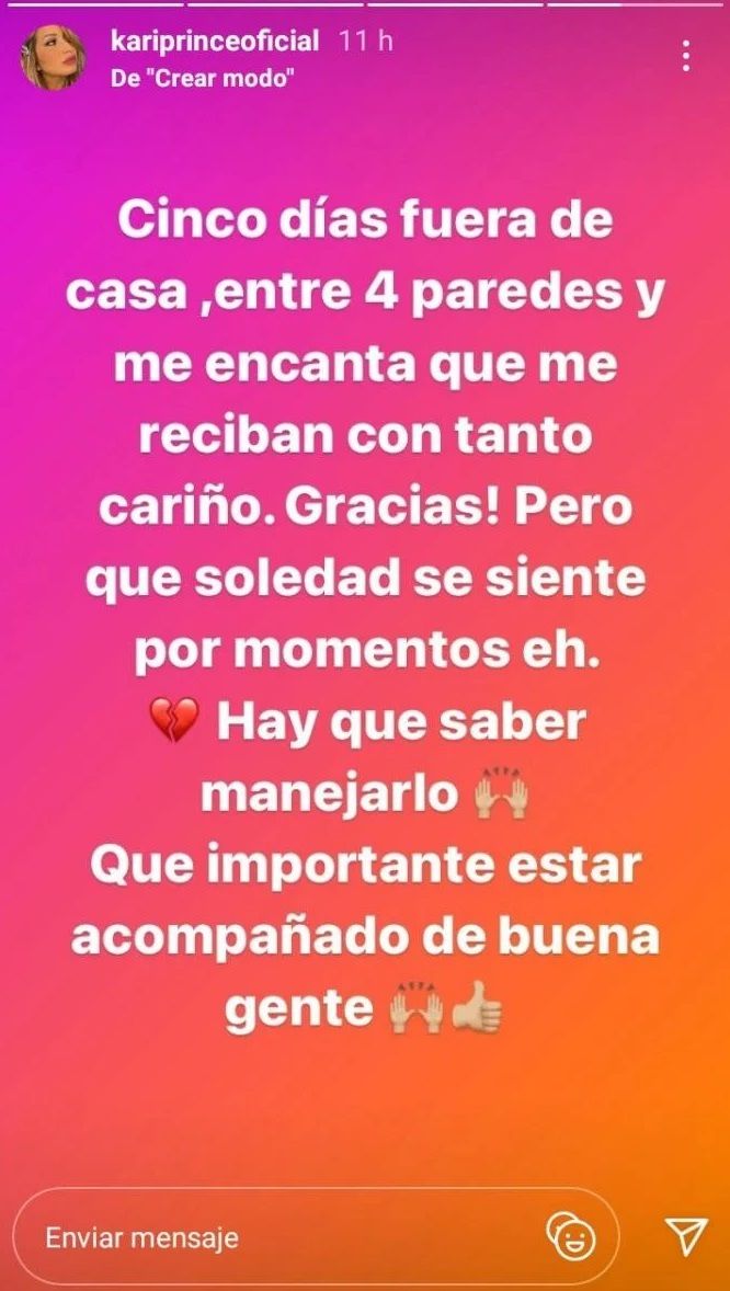 "Cinco días fuera de casa, entre 4 paredes y me encanta que me reciban con tanto cariño. ¡Gracias! Pero qué soledad se siente por momentos, eh. Hay que saber manejarlo. Que importante es estar acompañado de buena gente", indicó quien será parte del certamen "La Academia" que prepara Marcelo Tinelli.