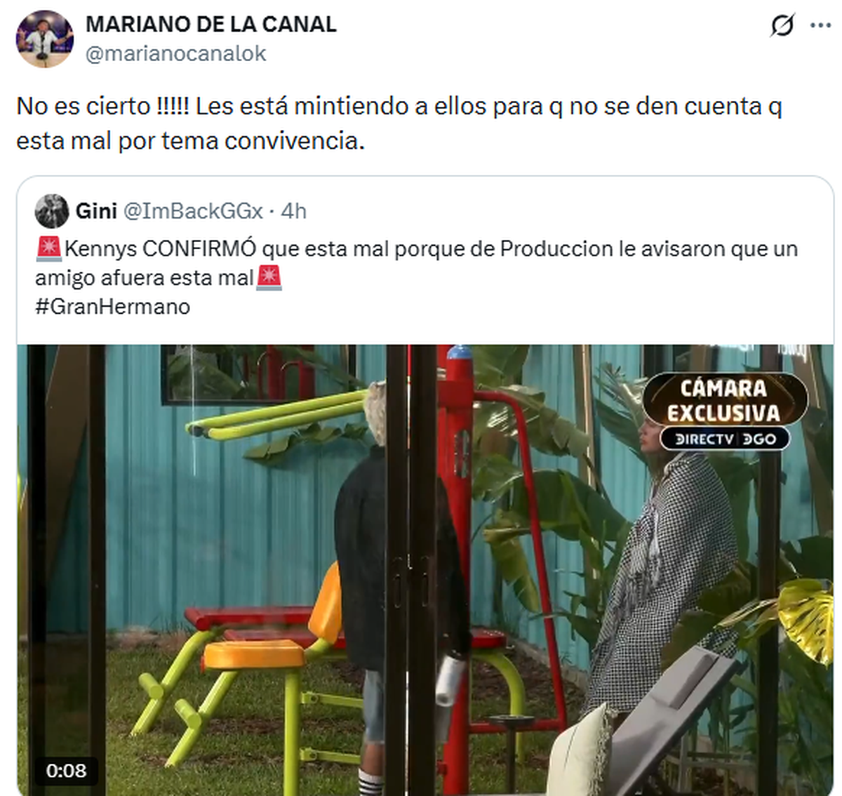 Sin embargo, Mariano de la Canal tomó la palabra y desmintió rotundamente esa versión que dio su amigo. "No es cierto. Les está mintiendo a ellos para que no se den cuenta que esta mal por tema convivencia", dijo de manera contundente en X.