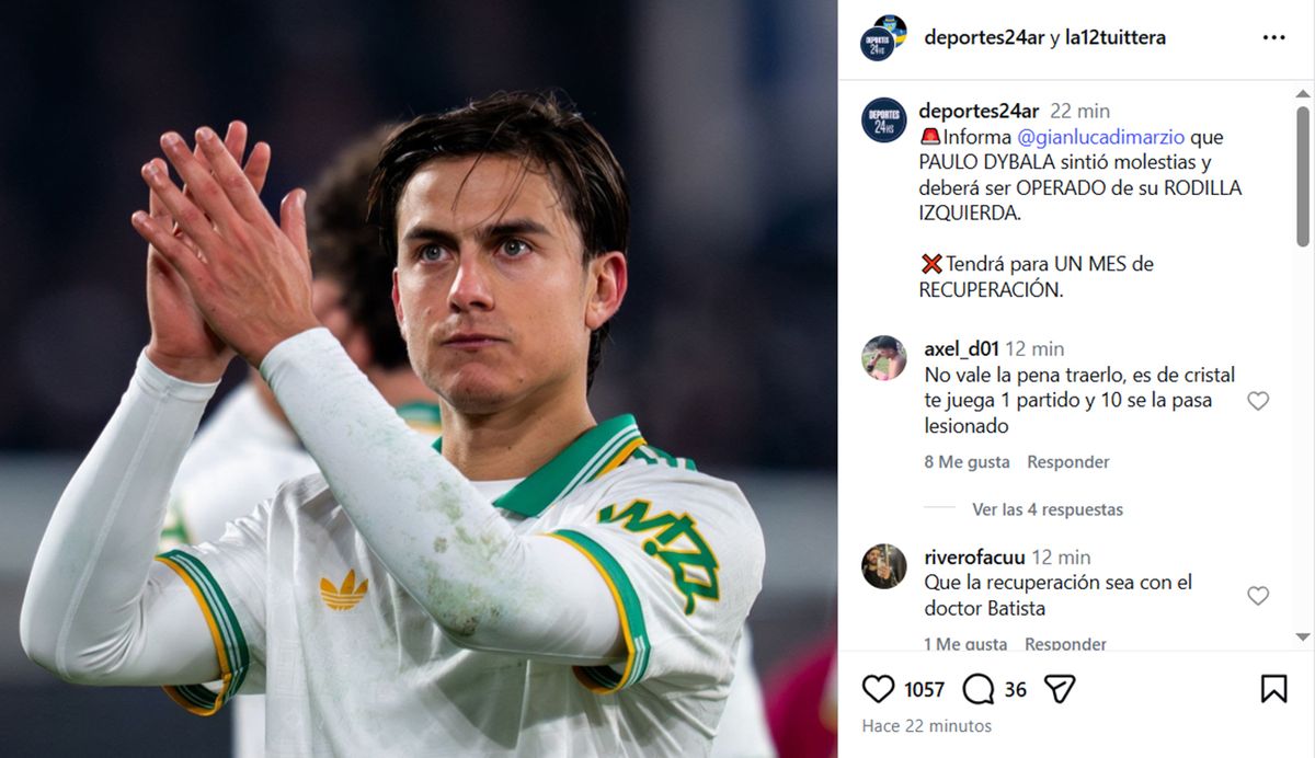 En medio de esa felicidad, Dybala atraviesa un momento delicado en lo deportivo. Según informaron, el delantero de la Roma “sintió molestias y deberá ser operado de su rodilla izquierda”. Los médicos estiman que “tendrá para un mes de recuperación”, lo que lo obligará a pausar su actividad profesional justo en el inicio de esta nueva etapa personal.