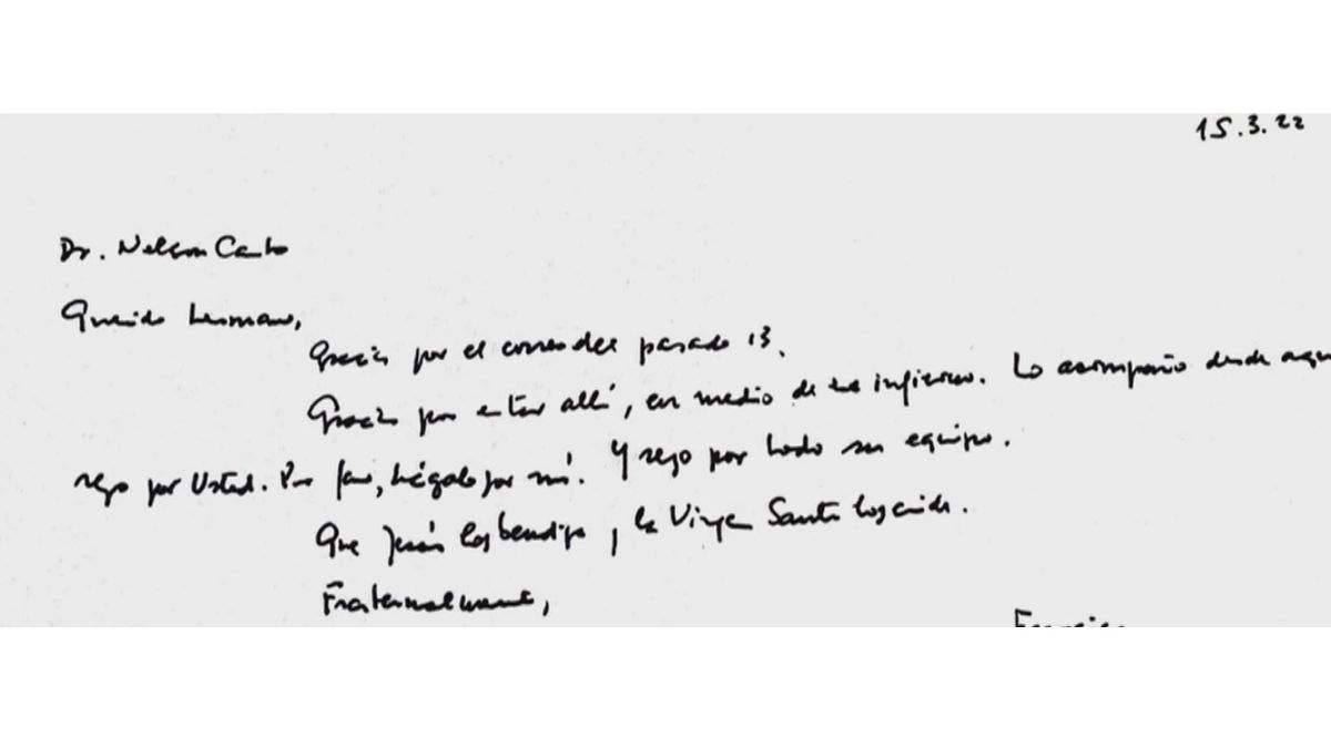 “Su secretario privado me mandó un mail con la carta manuscrita del papa Francisco y a mí me impactó”, indicó Nelson, de 66 años.