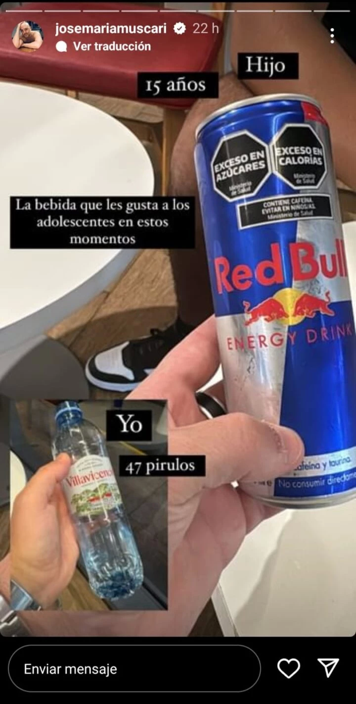 Todo comenzó cuando el director teatral mostró en sus historias que le dio a su hijo una conocida bebida energizante. “La bebida que les gusta a los adolescentes en estos momentos”, escribió riéndose de la situación ya que él al mismo tiempo se encontraba tomando agua.
