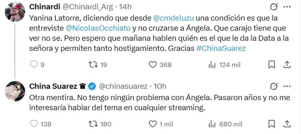 Ante el mensaje de una usuaria que la alertaba sobre esta versión tras la escandalosa cancelación de la entrevista pautada para este miércoles, la China Suárez comentó contundente sobre Ángela: "Otra mentira. No tengo ningún problema con Ángela. Pasaron años y no me interesaría hablar del tema en cualquier streaming".