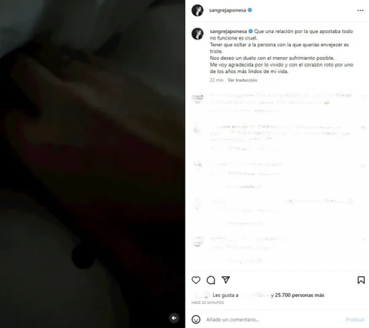El posteo entristeció a los seguidores de la pareja: “Es la primera vez que pone algo así después de una ruptura, ¿qué habrá pasado?”, “Chinita, no queremos que sufras”, “no quería creerlo, espero que lo transiten de la mejor manera posible”, y “qué pena que no haya funcionado una pareja tan bonita”, fueron algunos de los mensajes que aparecieron en el perfil de la actriz.