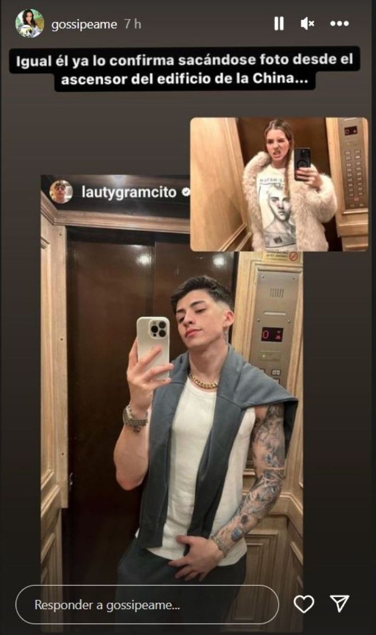Ahora, Pochi de la cuenta Gossipeame mostró un detalle clave que confirmaría la relación entre la actriz y el cantante. “Igual él ya lo confirma sacándose foto desde el ascensor del edificio de la China”, escribió Pochi en una historia de Instagram en la que aparecen dos fotos distintas de Lauty y la China utilizando el mismo ascensor.