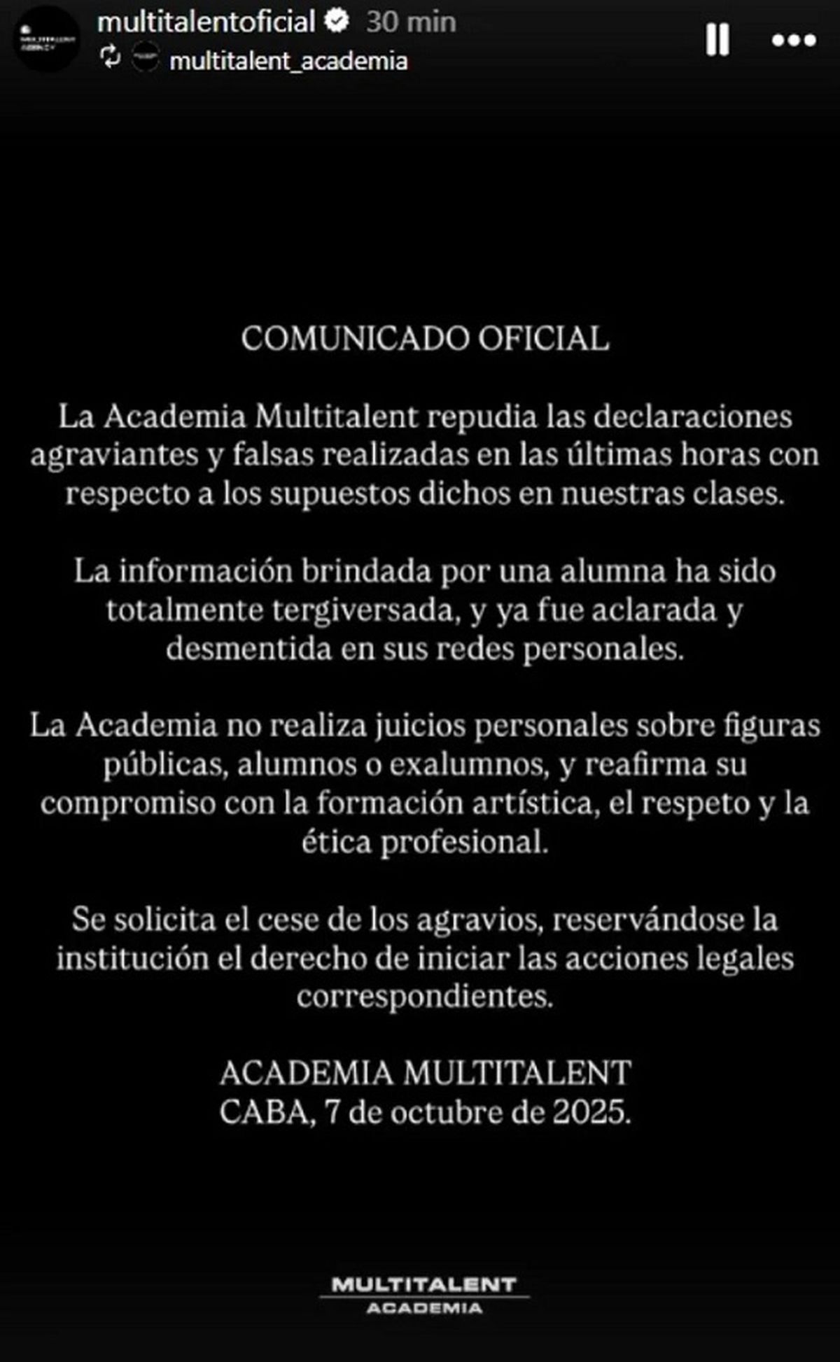 “La Academia Multitalent repudia las declaraciones agravantes y falsas realizadas en las últimas horas con respecto a los supuestos dichos en nuestras clases. La información brindada por una alumna ha sido totalmente tergiversada, y ya fue aclarada y desmentida en sus redes personales”, expresaron desde la empresa.