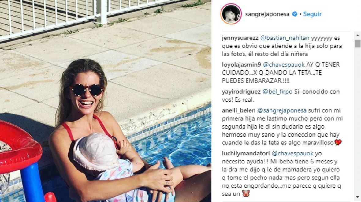 La actriz salió al cruce de los comentarios negativos que recibió tras publicar una tierna postal dándole la teta a su beba, fruto de su amor con Benjamín Vicuña, en la pileta. Otros tantos la bancaron.