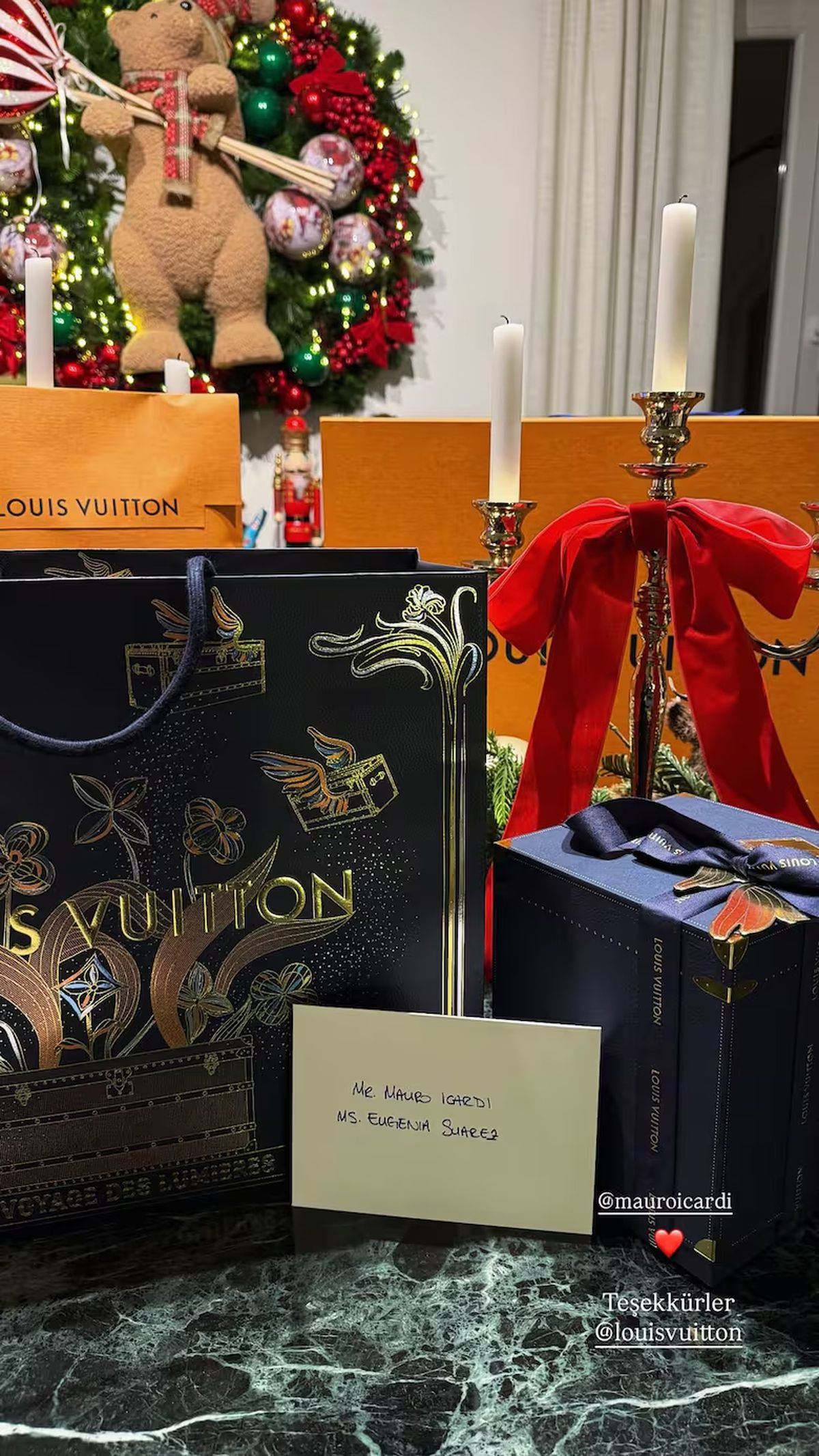 En las imágenes que publicó, se pudo ver varias cajas de la reconocida firma Louis Vuitton. En el centro, una tarjeta manuscrita que decía: “Sr Mauro Icardi y Sra Eugenia Suárez”. La ex Casi Ángeles acompañó la publicación etiquetando al futbolista y sumando el clásico “teekkürler” (“gracias” en turco), además de mencionar a la marca y cerrar con un emoji de corazón.