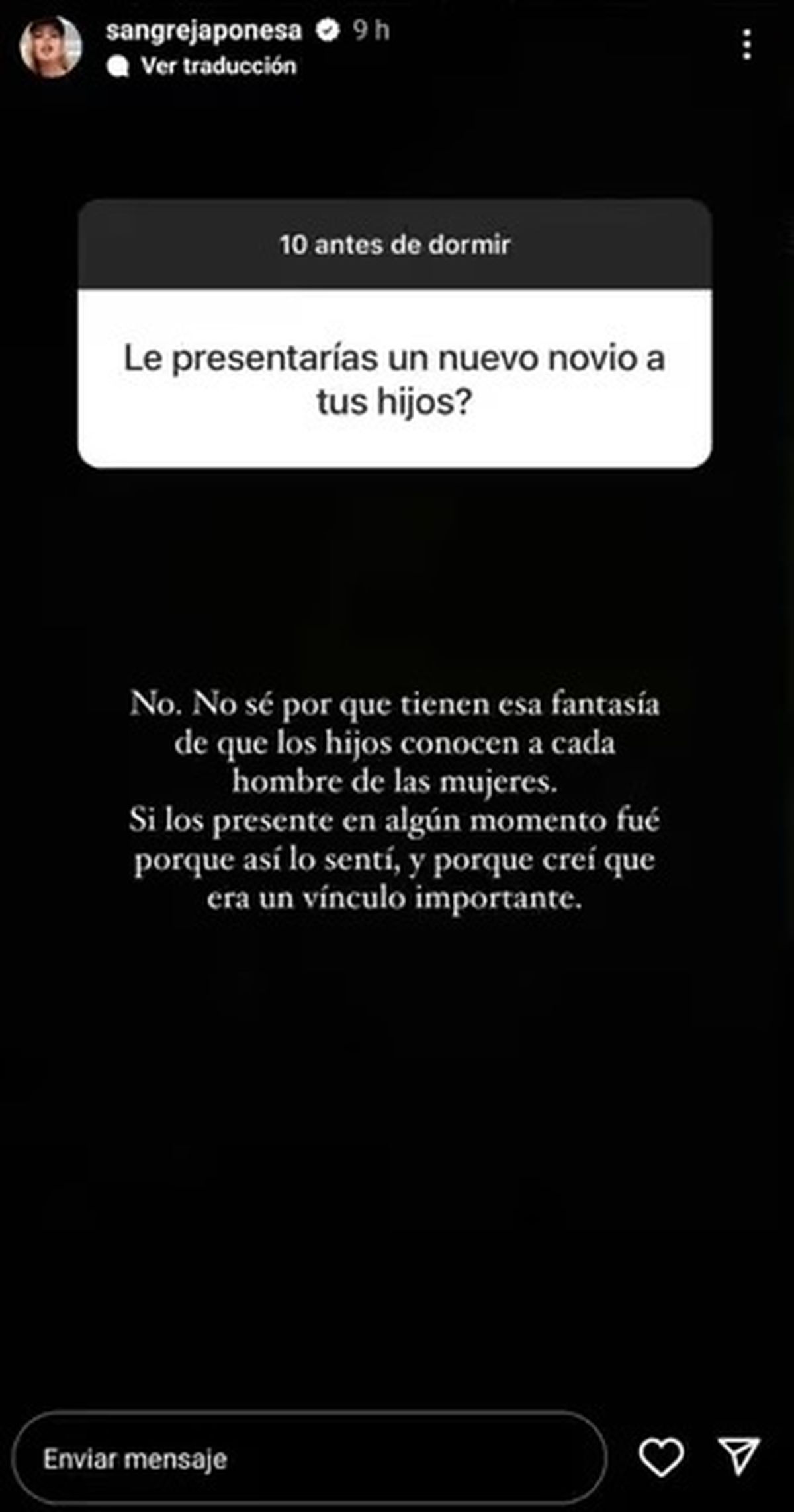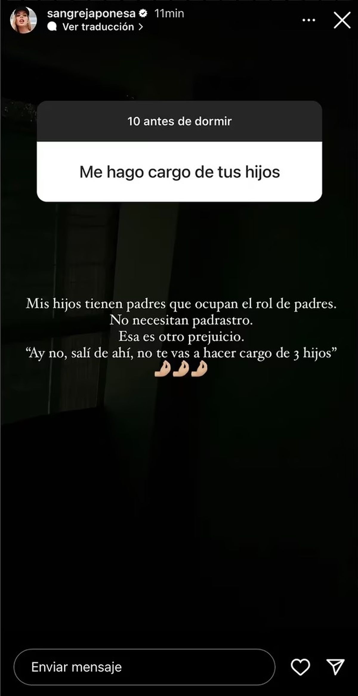 "Mis hijos tienen padres que ocupan el rol de padres. No necesitan padrastro. Esa es otro prejuicio", lanzó molesta por la apurada canchera y le respondió al seguidor: "Ay no, salí de ahí, no te vas a hacer cargo de 3 hijos" junto a tres emojis de una mano haciendo montoncito, dando por finalizado el tema.