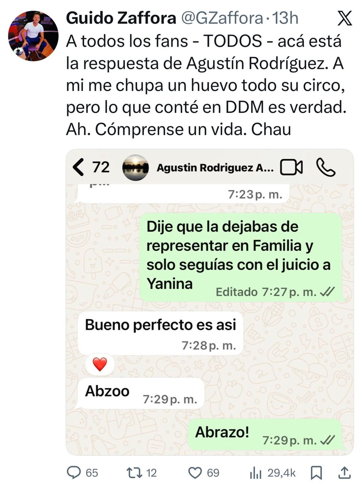 En tanto, minutos después Guido Záffora republicó su propio posteo y agregó misterioso: "Sé a qué abogado llamó y le dijo que no, y por qué renunció Agustín", si bien esos datos optó por no revelarlos.