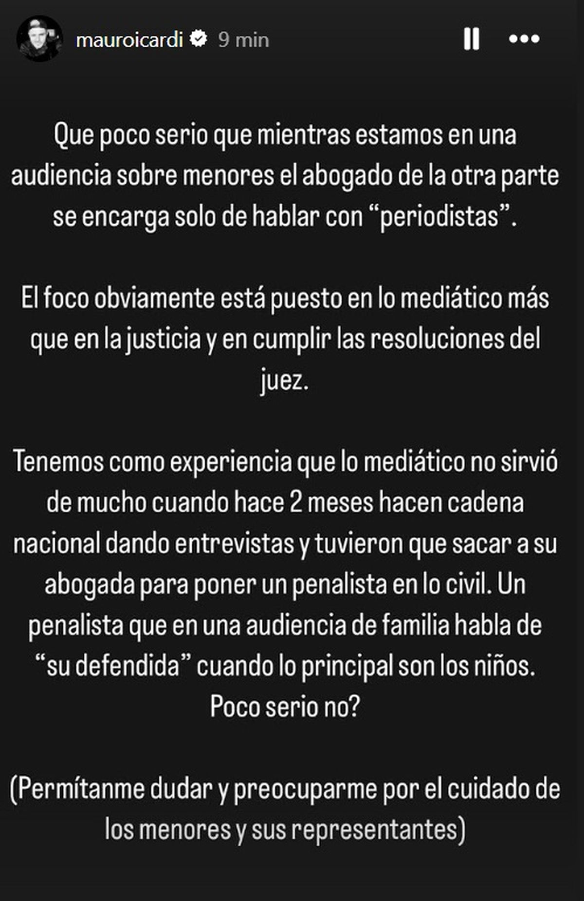 "Qué poco serio mientras estamos en una audiencia sobre menores el abogado de la otra parte se encarga solo de hablar con 'periodistas'", comenzó su escrito desde sus historias en la red social.