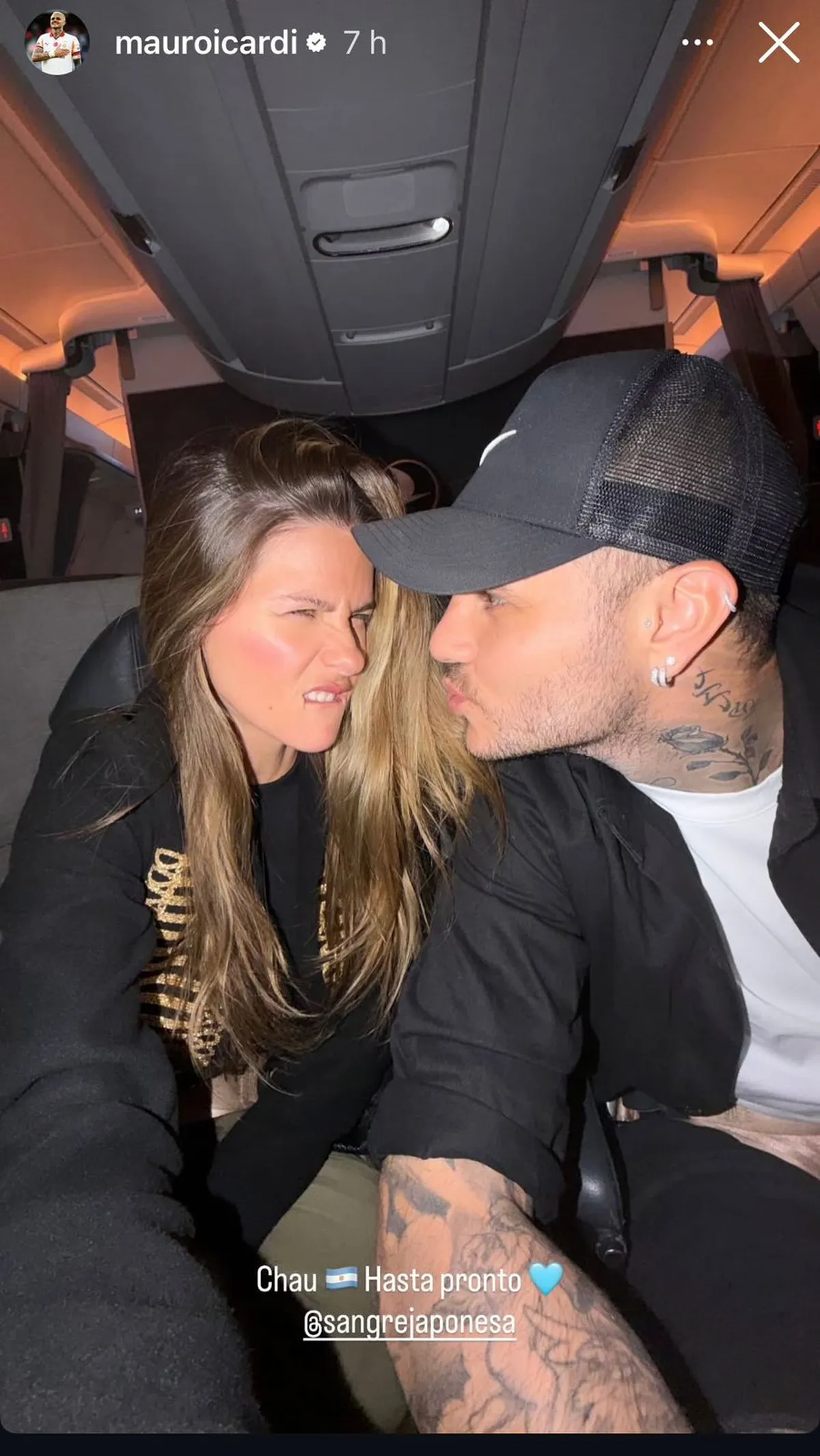 Una vez ya arriba del avión, la pareja compartió una particular foto donde se lo ve a Mauro querer darle un beso a la China y ella mordiéndose los labios.