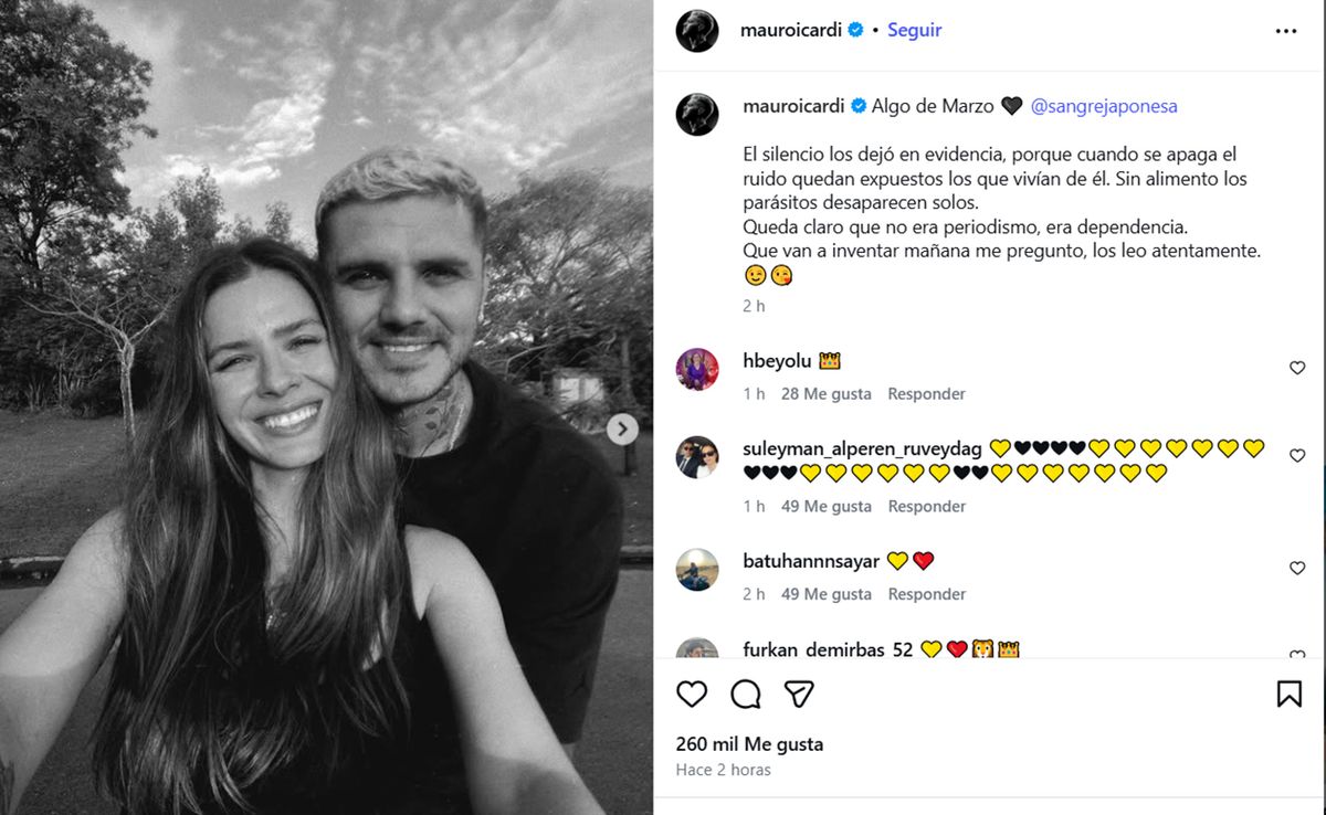 El posteo no se limitó a lo romántico. Icardi aprovechó para enviar un mensaje directo a quienes lo critican: “El silencio los dejó en evidencia, porque cuando se apaga el ruido quedan expuestos los que vivían de él. Sin alimento los parásitos desaparecen solos. Queda claro que no era periodismo, era dependencia. Que van a inventar mañana me pregunto, los leo atentamente”.