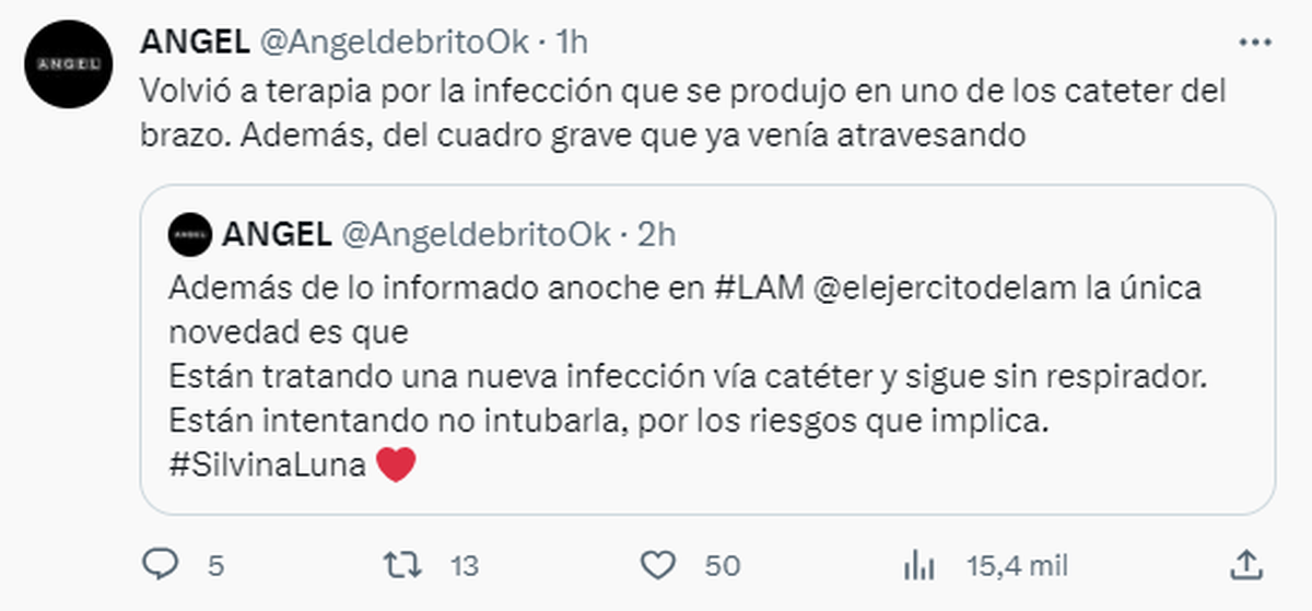 En las últimas horas, en su cuenta de Twitter, Ángel de Brito reveló más detalles sobre la salud de Silvina Luna. "Además de lo informado anoche en #LAM, la única novedad es que están tratando una nueva infección vía catéter y sigue sin respirador. Están intentando no intubarla, por los riesgos que implica", explicó.