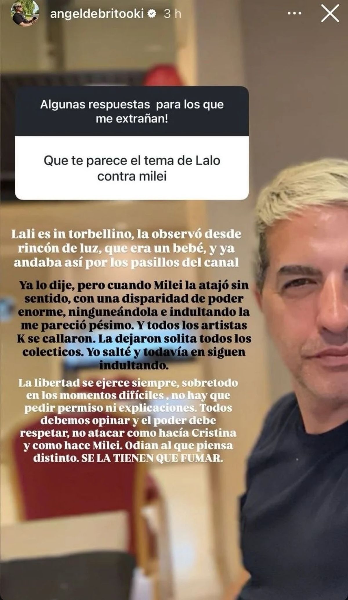 Lo cierto es que hasta el día de hoy ese picante ida y vuelta está más vigente que nunca, en el que muchas figuras del espectáculo prefirieron mantenerse en silencio, actitud que justamente fue criticada por Ángel de Brito quien expuso lo sola que quedó Espósito frente a semejante embestida del poder político.