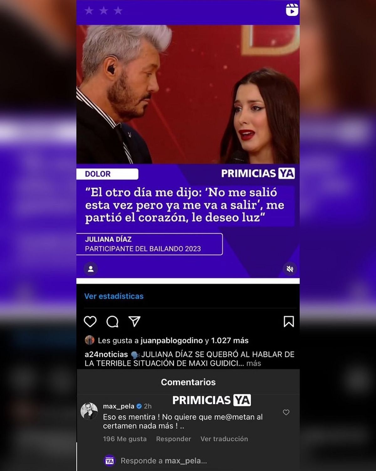 Maxi vio una publicación de PrimiciasYa en Instagram, con los dichos de Juliana, y en los comentarios se mostró indignado. "Eso es mentira! No quiere que me metan al certamen, nada más...!", disparó.