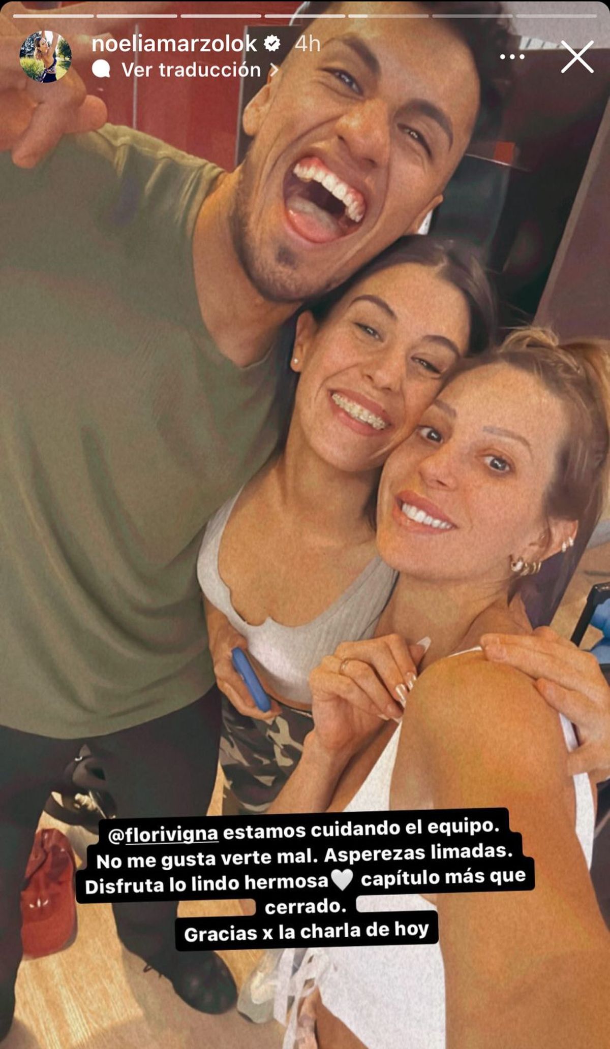 Frente al gesto de Flor, la bailarina decidió responder de la misma forma, a través de una story, y escribió: "Flor estamos cuidando al equipo. No me gusta verte mal. Asperezas limadas. Disfruta lo lindo hermosa. Capitulo más que cerrado".