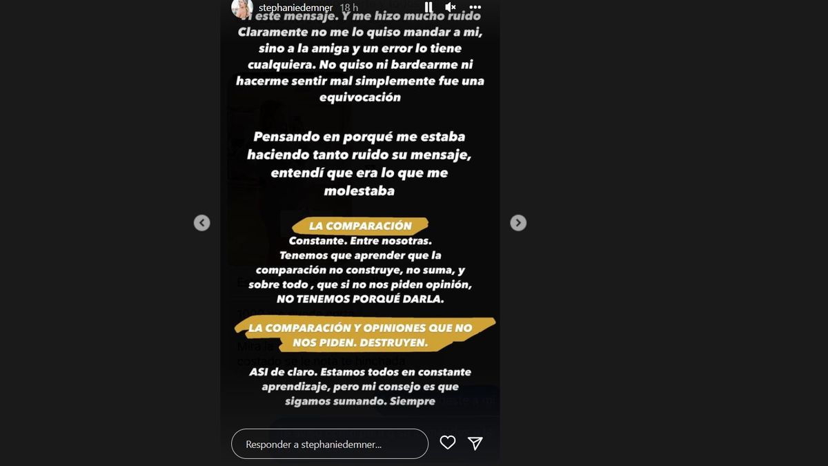Y luego explicó por qué decidió replicar ese comentario: “Vi este mensaje. Y me hizo mucho ruido. Claramente no me lo quiso mandar a mí, sino a la amiga y un error lo tiene cualquiera. No quiso ni bardearme ni hacerme sentir mal, simplemente fue una equivocación”.