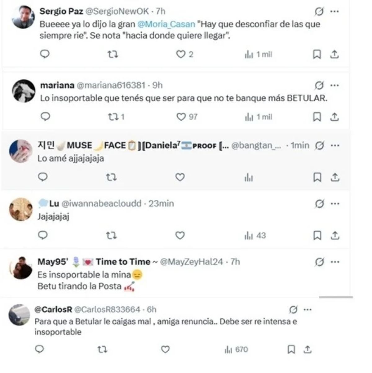"Bueee ya lo dijo la gran Moria Casán 'Hay que desconfiar de las que siempre se ríen'. Se nota 'hacia dónde quiere llegar'", "Lo insoportable que tenés que ser para que no te banque más Betular", "Es insoportable la mina. Betu tirando la posta", o "Para que a Betular le caigas mal, amiga renunciá... Debe ser re intensa e insoportable", fueron algunos de los tantísimos comentarios que pudieron leerse en la red social X.