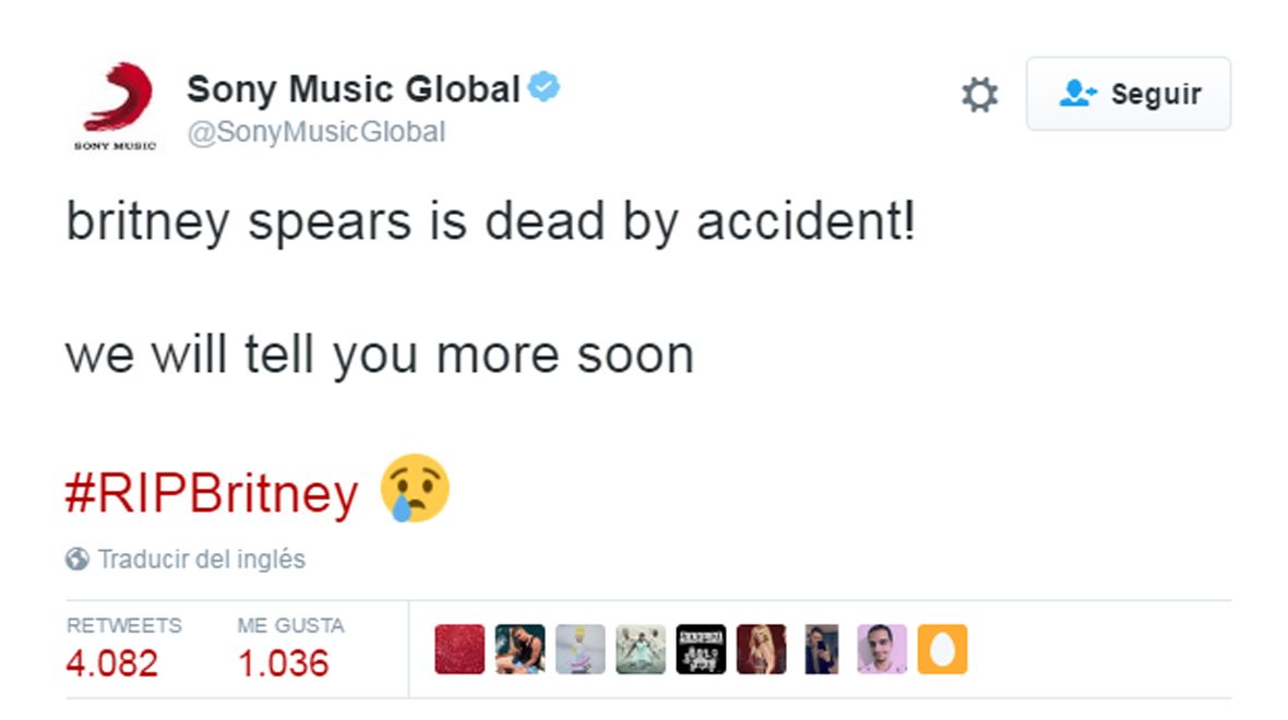 Minutos después, la cuenta @SonyMusicGlobal, desde donde se habían tuiteado los mensajes, informó que fueron hackeados y que Britney "aún está viva".