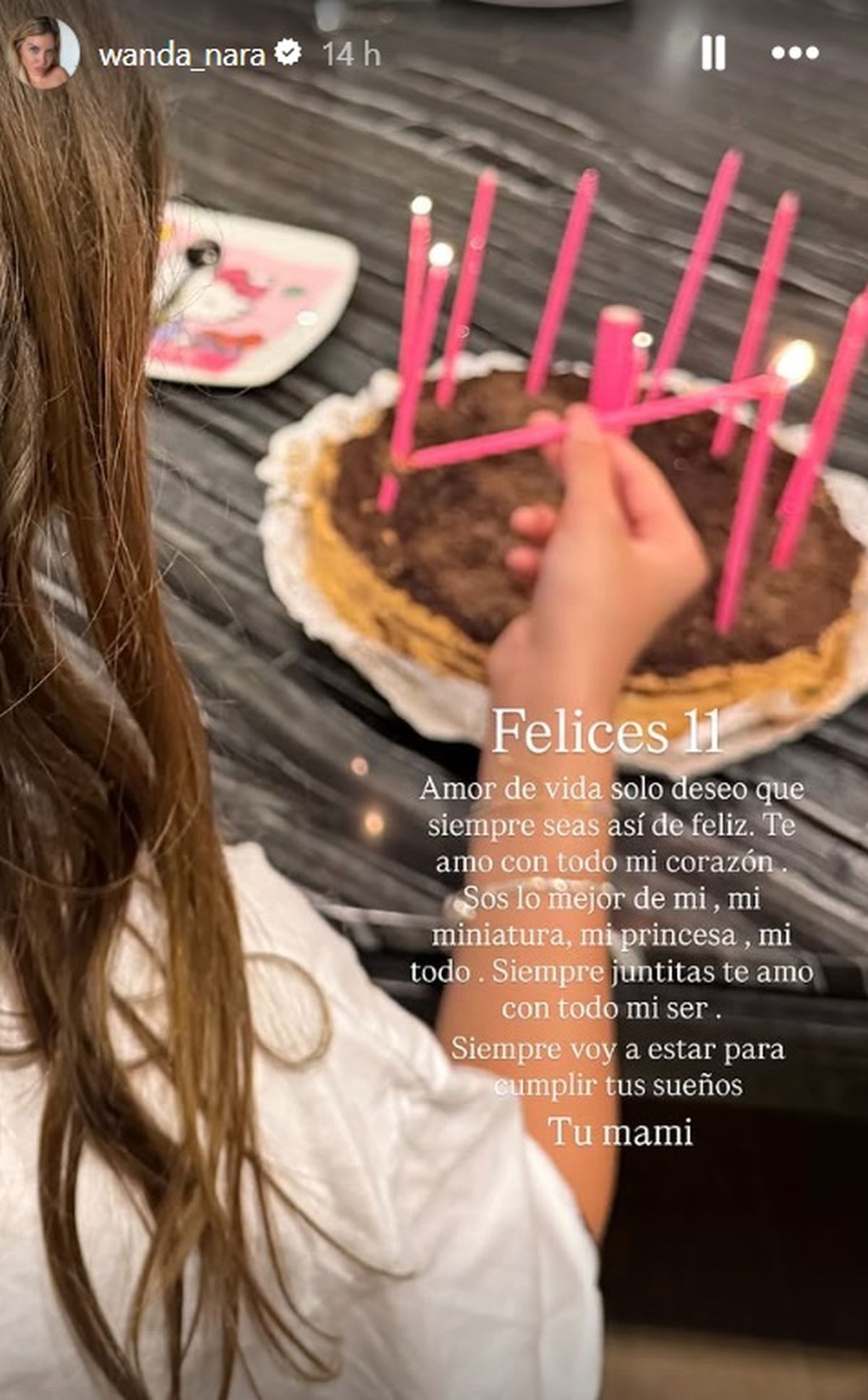 "Felices 11. Amor de vida solo deseo que siempre seas así de feliz. Te amo con todo mi corazón. Sos lo mejor de mí, mi miniatura, mi princesa, mi todo", expresó la conductora de MasterChef Celebrity (Telefe) con una imagen de su hija de espaldas junto a la torta de cumpleaños y las velitas.
