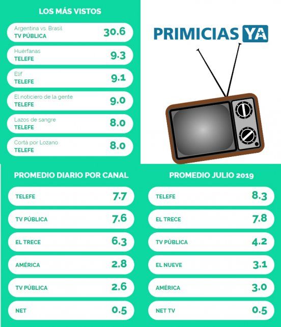 El rating del partido que Argentina perdió contra Brasil puso a la Tv Pública como segundo canal más visto en el promedio diario con 7.6. Lideró Telefe con 7.7 y El Trece fue tercero con 6.3. América se ubicó cuarto con 2.8, El Nueve quinto con 2.6 y Net sexto con 0.7.