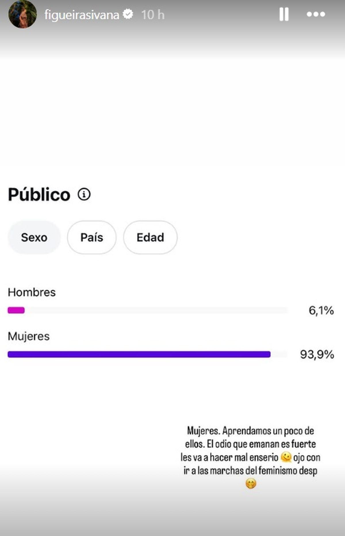 "El odio les va a hacer mal", reflexionó contundente Ivana Figueiras contra sus críticos. Y mostró un dato virtual con respecto al mayor alcance en público femenino que tiene por sobre los hombres.