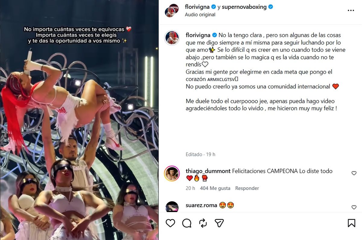 Desde su cuenta en Instagram, Flor Vigna reflexionó después sobre esta nueva experiencia en el boxeo y relacionándolo con la vida y los difíciles momentos que atravesió.