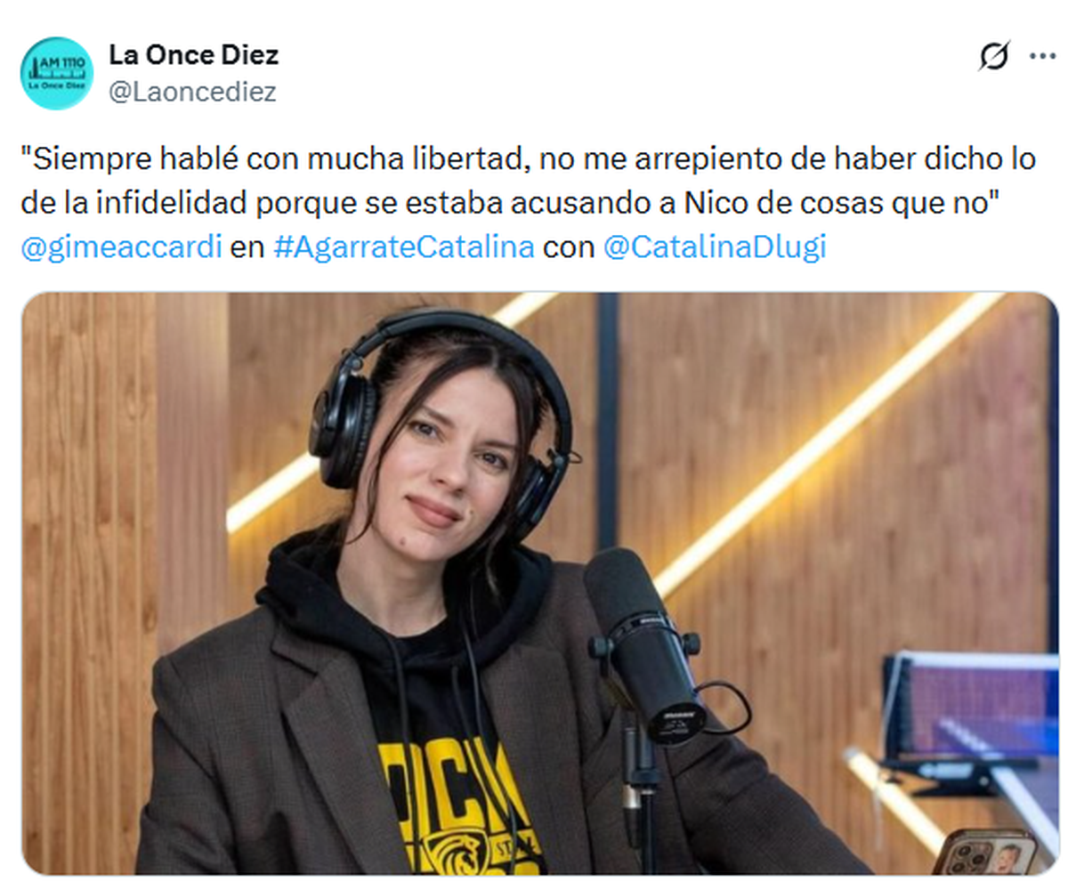 Más tarde, explicó por qué decidió hacer pública la situación, pese a que se trata de un asunto estrictamente personal: "Necesité salir a aclararlo, esta es la verdad y soy yo con miles de defectos. Nico no había hecho nada y se lo vinculó con total certeza con dos compañeras de trabajo y eso era mentira. Y bueno, ahora el ojo lo tengo yo y me bancaré la que venga".