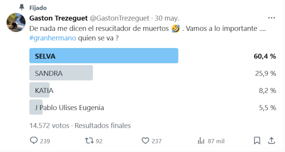 Según las encuestas de Gastón Trezeguet y Fede Bongiorno, Selva Pérez Carvalho, la uruguaya de 51 años es la primera candidata a irse esta semana con más del 40% de los votos en redes.