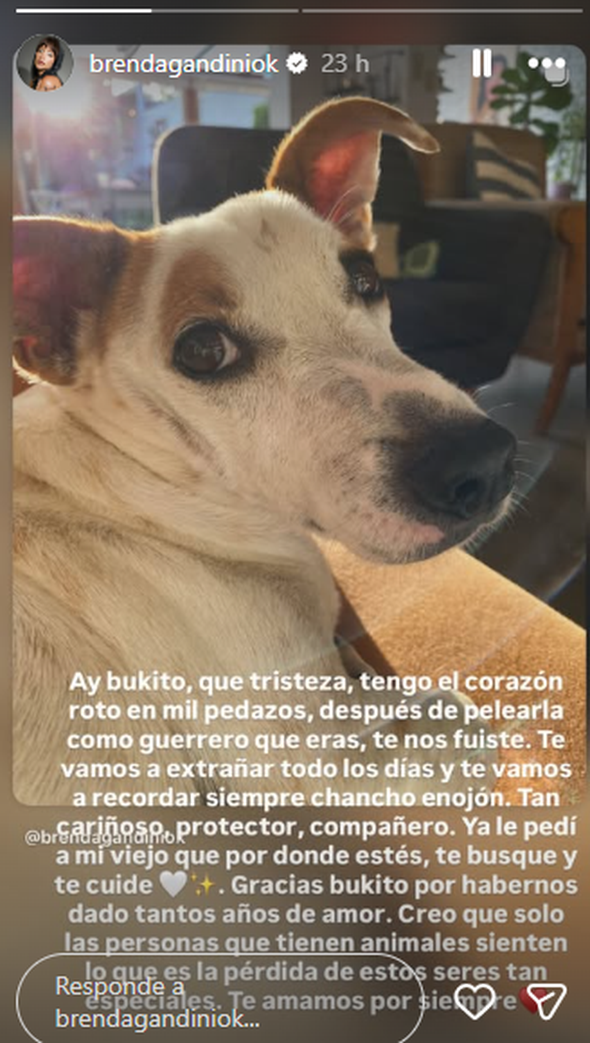 A través de un sentido mensaje, Gandini expresó el amor incondicional que los unió y el vacío que deja su partida, reflejando el impacto emocional que significó para toda la familia despedir a un ser tan querido, que durante años fue parte fundamental de su día a día. “Ay Bukito, qué tristeza, tengo el corazón roto en mil pedazos, después de pelearla como guerrero que eras, te nos fuiste”, escribió.