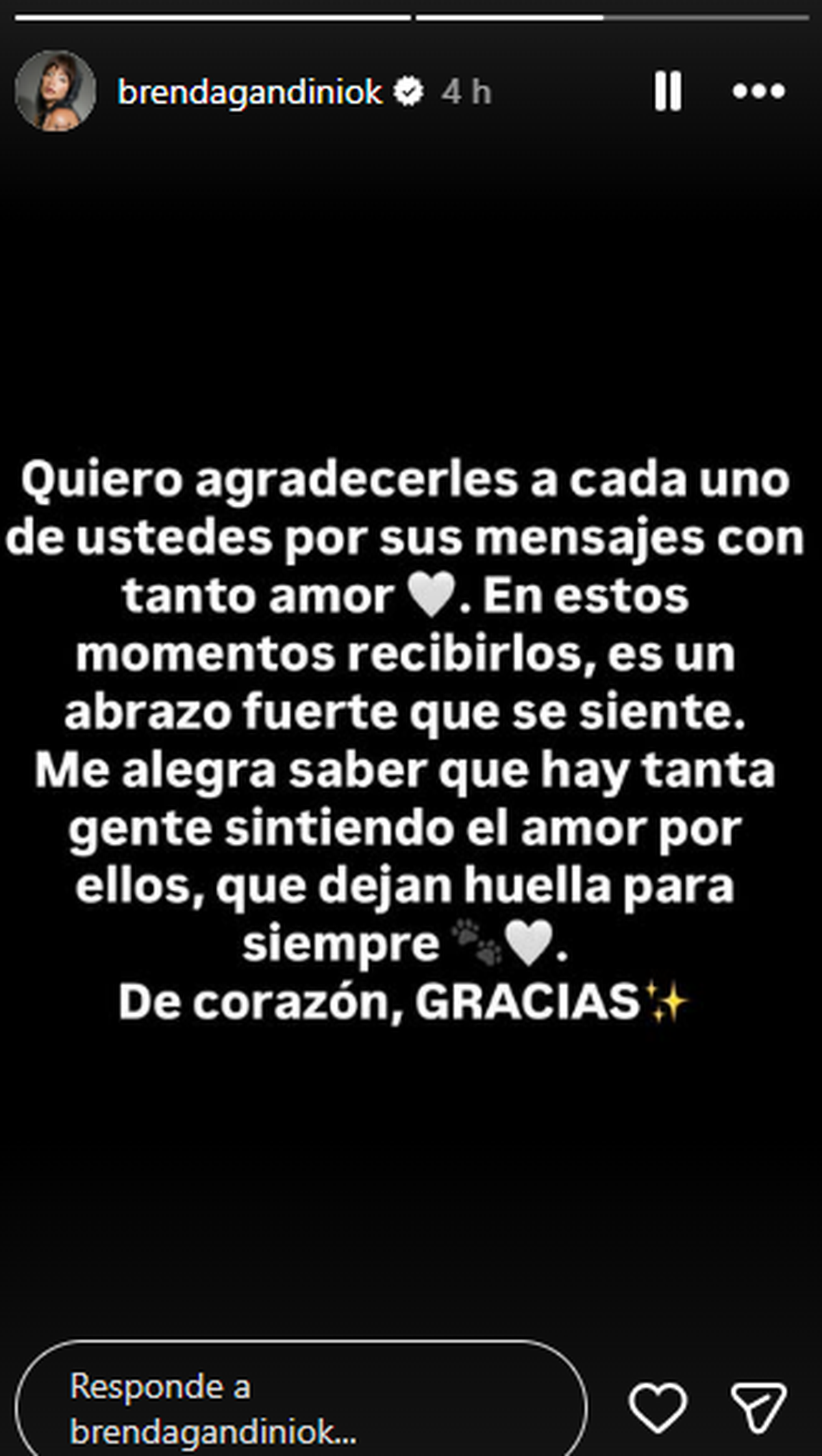 La repercusión fue inmediata. Decenas de mensajes de apoyo y cariño inundaron su perfil. Lejos de pasarlo por alto, Gandini hizo un nuevo posteo para sus seguidores: "Quiero agradecier a cada uno de ustedes por sus mensajes de amor. En estos momentos recibirlos, es un abrazo fuerte que se sienta. Me alegra saber que hay tanta gente sintiendo el amor por ellos, que dejan huellas para siempre. De corazón, GRACIAS".