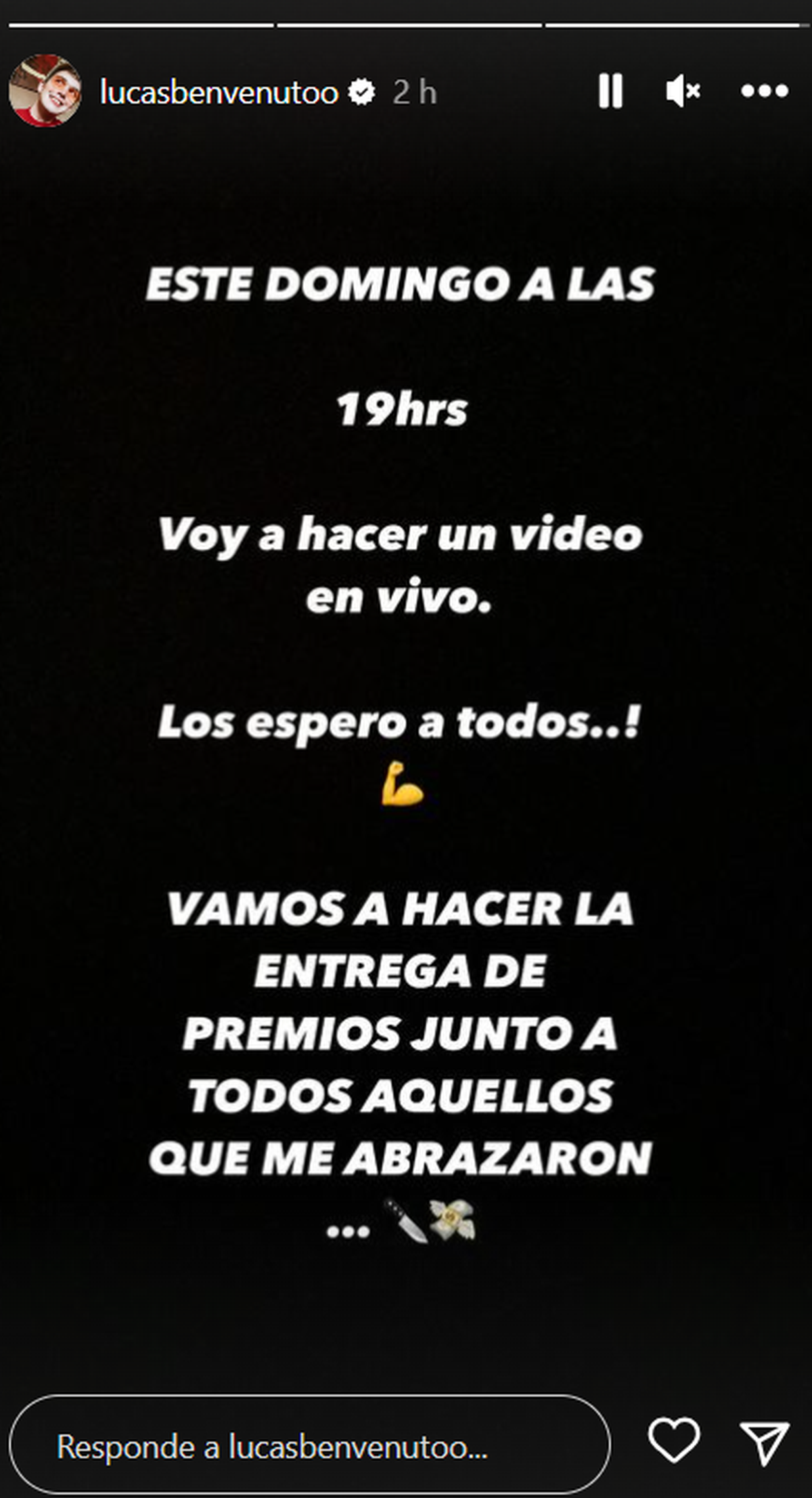 En el mismo posteo, Lucas Benvenuto indició que realizará un seguimiento de lo que suceda en los Martín Fierro. "Vamos a hacer la entrega de premios junto a todos aquellos que me abrazaron", finalizó.